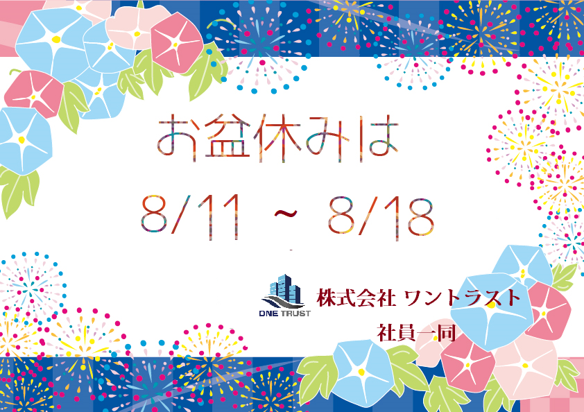 株式会社ワントラストでは、 下記の期間をお盆休み休業とさせていただきますのでご案内申し上げます。