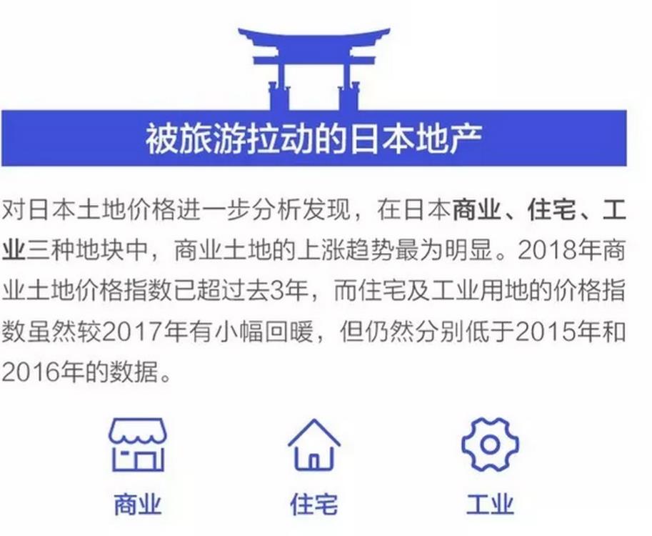 不过,最新的数据统计表明,2018年日本地产再次迎来了曙光,不论是日本全国整体地价,还是汇聚了日本近半人口的三大核心都市圈,2018年地价首次收获了上涨,这是27年后日本地产复苏的明显迹象。日本地产复苏,除了与日本整体经济的复苏有关以外,也依赖于近年来旅游业的强势发展,其中800万中国游客更是成为拉动日本地产复苏的关键因素之一。